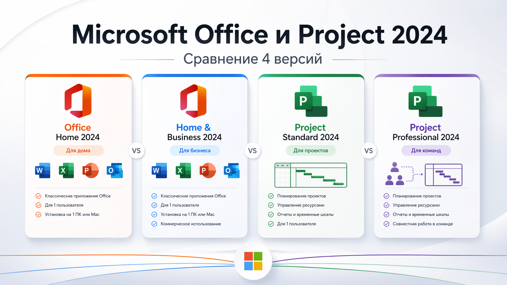 | Характеристика | Office Home 2024 Для быта | Office Home & Business 2024 Для бизнеса | Project Standard 2024 Для индивидуалов | Project Professional 2024 Для корпораций |